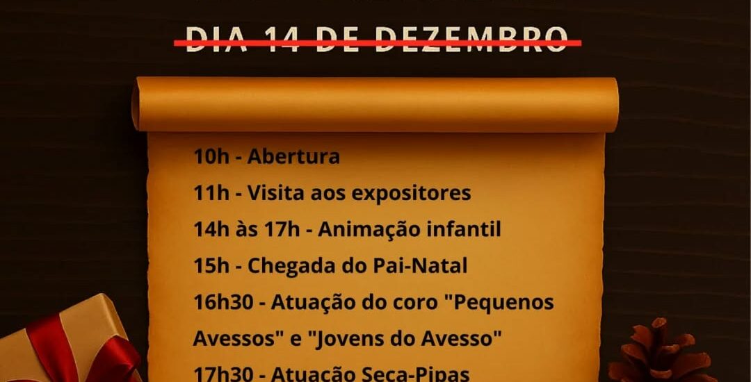 Lamentamos informar que o Mercadinho de Natal, previsto para o dia 14 de dezembro (domingo), foi adiado para o dia 21 de dezembro, devido às condições meteorológicas adversas, nomeadamente o vento forte que impossibilita a montagem das tendas e compromete a segurança de todos.